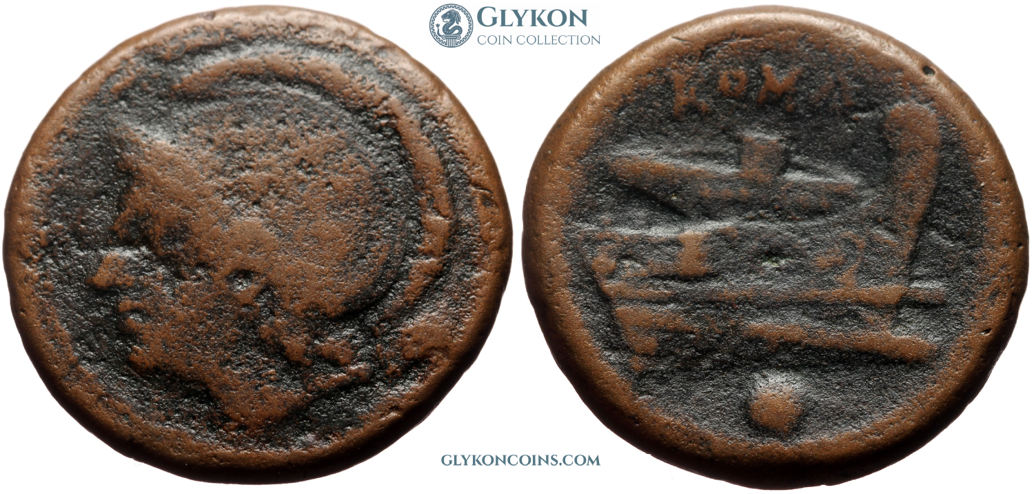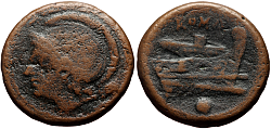 Obverse: Helmeted head of Roma to left, pellet behind. Reverse: Ship's prow to right, pellet below. Legend: ROMA. |