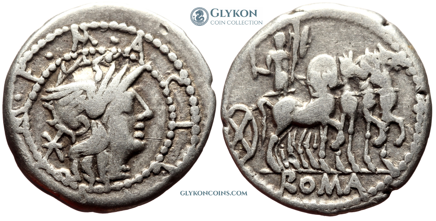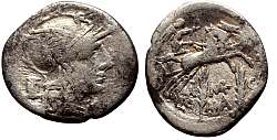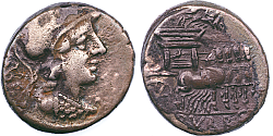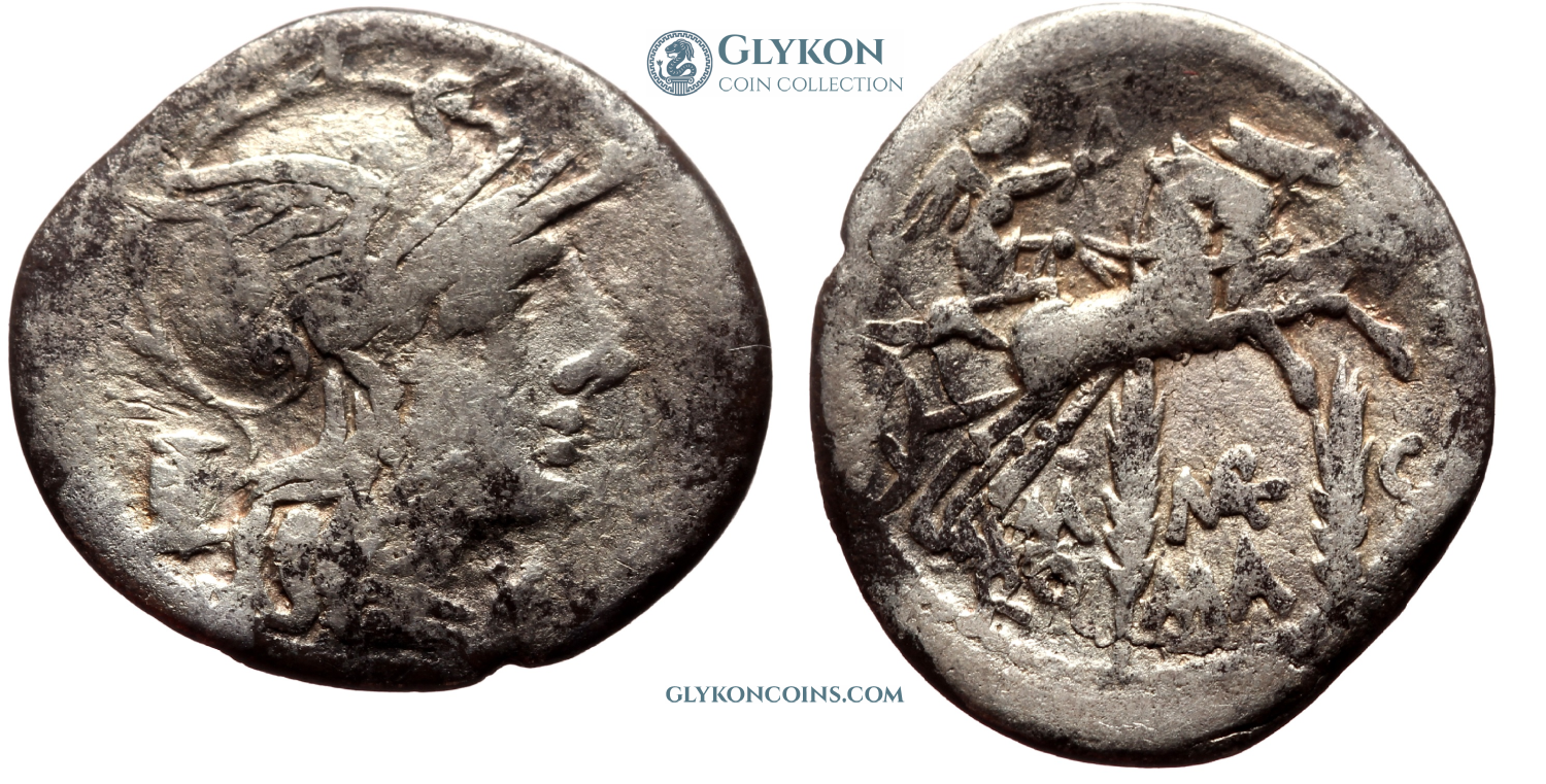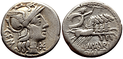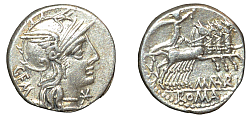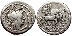 Obverse: Helmeted head of Roma to right. Star or monogram behind. Legend: M·ACILIVS·M·F between two circles of dots. Reverse: Hercules driving a quadriga to right, holding a tropheum and reins in one hand and club in another. Legend: ROMA in exergue. |