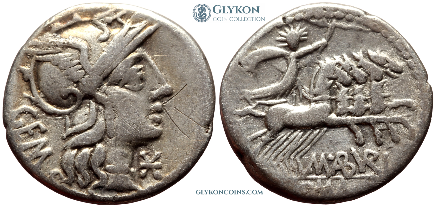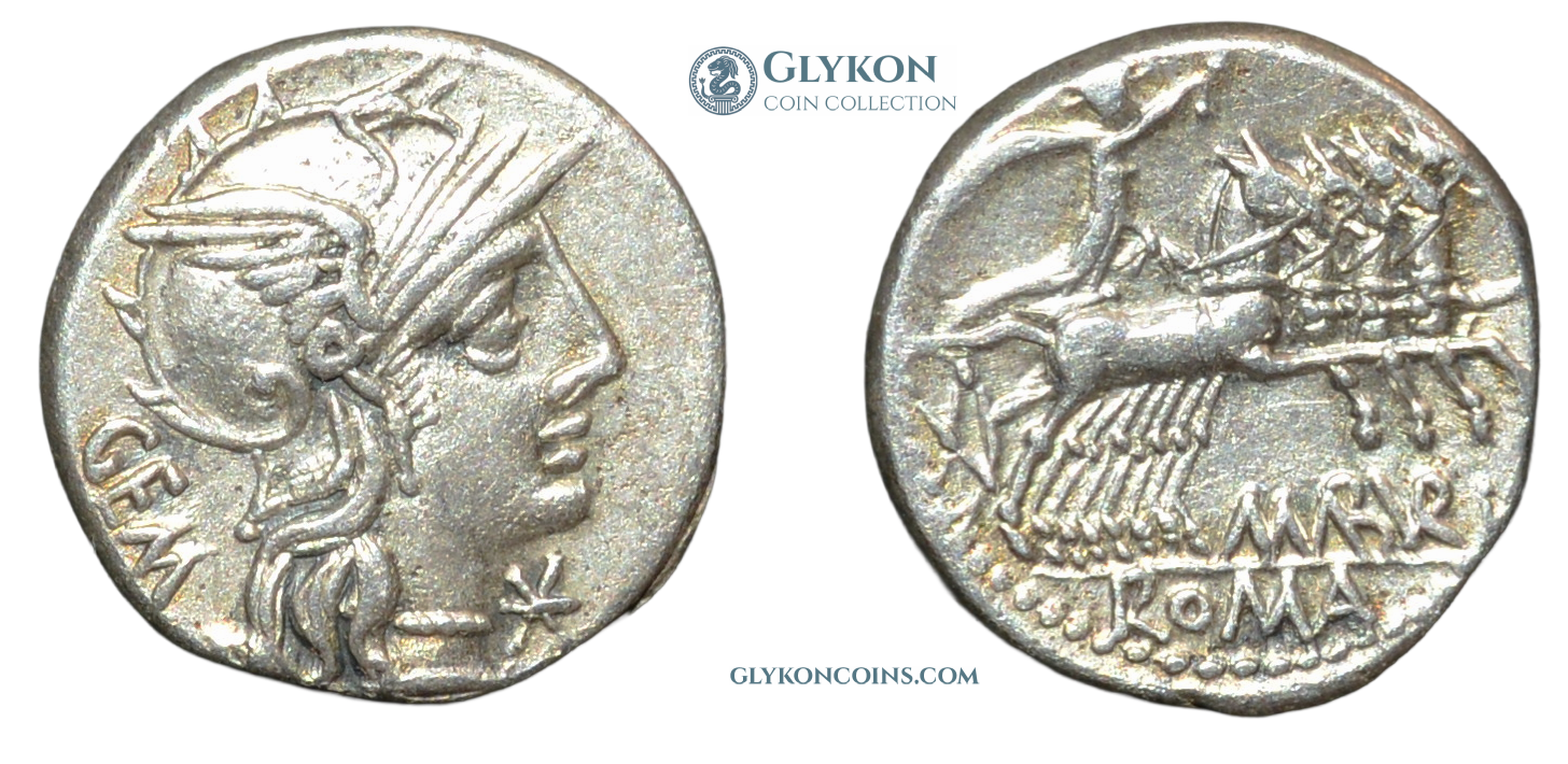 Obverse: Helmeted head of Roma to right, modius behind, star lower right. Reverse: Victory driving racing biga to right, holding reins and whip. Legend: C MAR C - ROMA, divided by two grain ears.