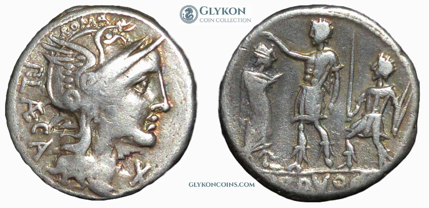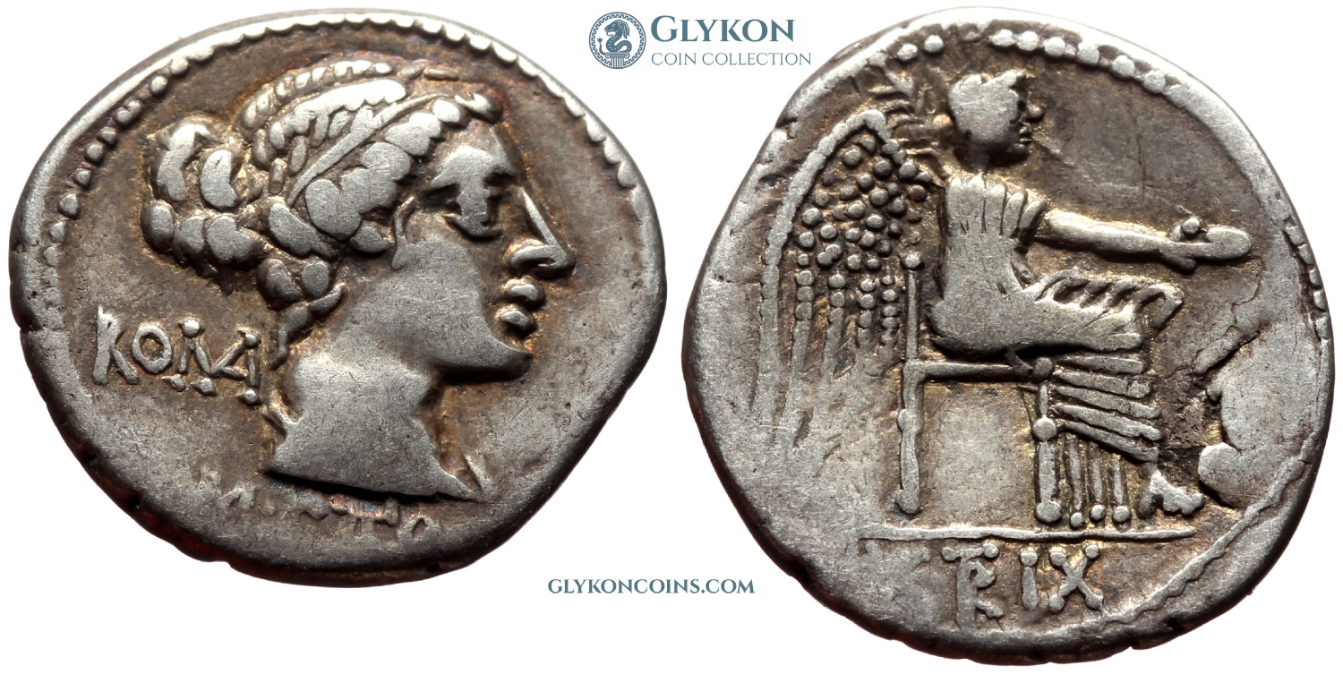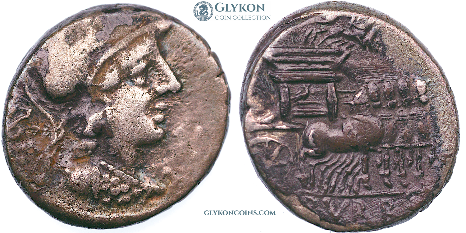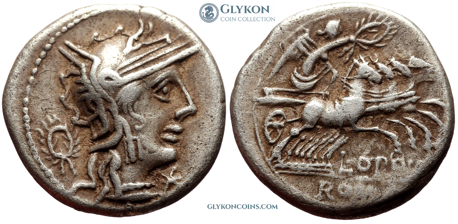 Initially, republican denarii adhered to a consistent pattern with only minor variations: the obverse typically featured the head of a deity, such as the goddess Roma, personifying Rome, while the reverse depicted either a deity in a chariot or divine armored horsemen (or horseman). Occasionally, small additions or modifications were introduced. However, as the political struggle between aristocratic factions intensified, the coins began to incorporate more intricate details, ultimately leading to the complete abandonment of the old design.