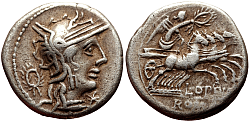 Obverse: Helmeted head of Roma to right, wreath left, star lower right. Reverse: Victory driving racing quadriga to right, holding reins and whip. Legend: L·OPEIMI - ROMA. |