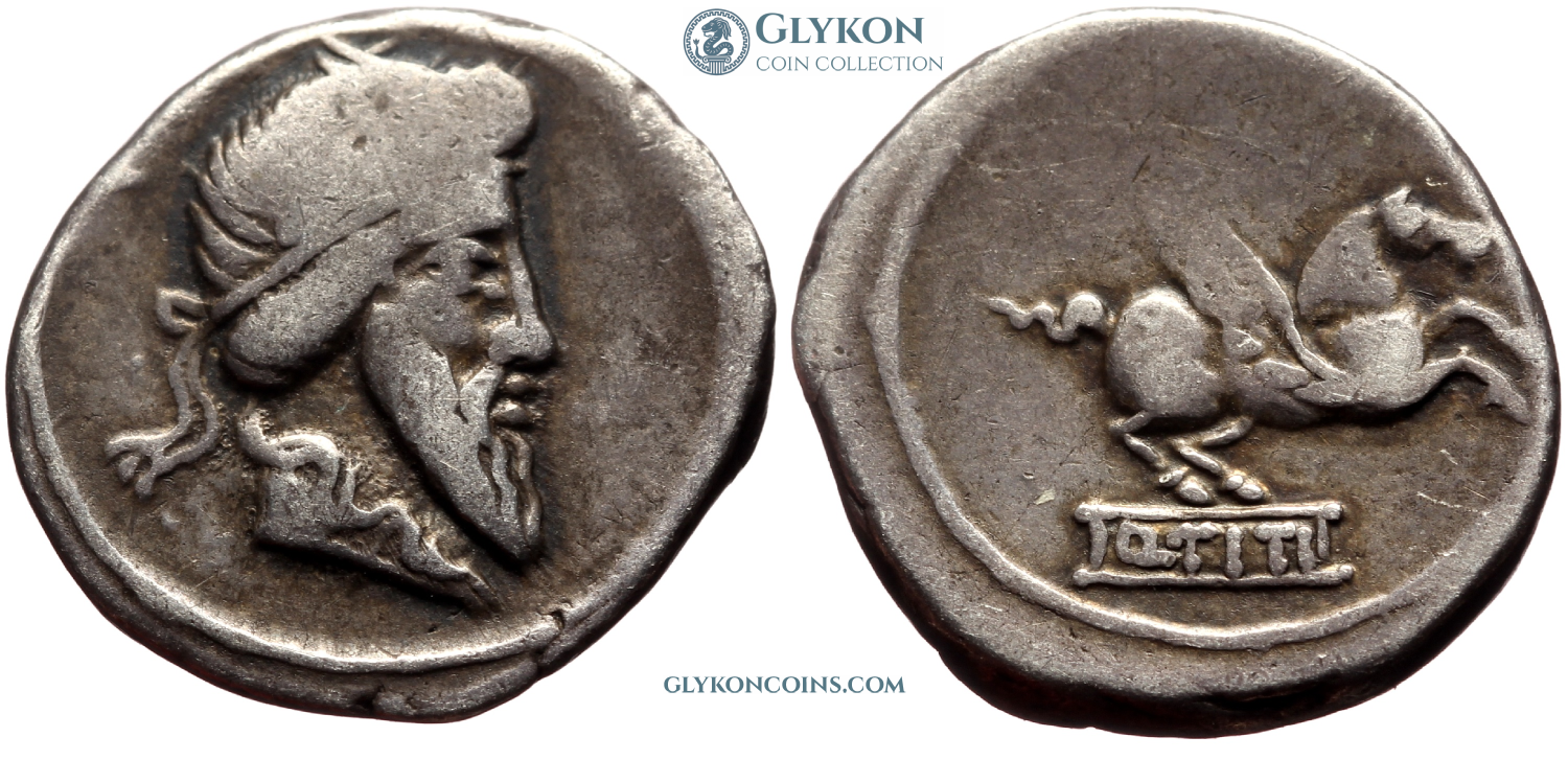 Obverse: Bearded head of Titinus (fertility deity) to right, wearing winged diadem. Reverse: Pegaus prancing to right. Legend: Q.TITI. |