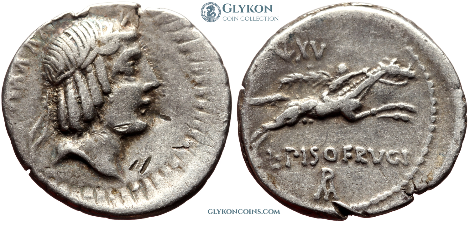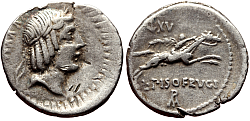 Obverse: Laureate head of Apollo to right. Banker's marks. Reverse: Horseman galloping to right, holding palm branch. Legend: L·PISOFRVGI. Monograms above and below. |