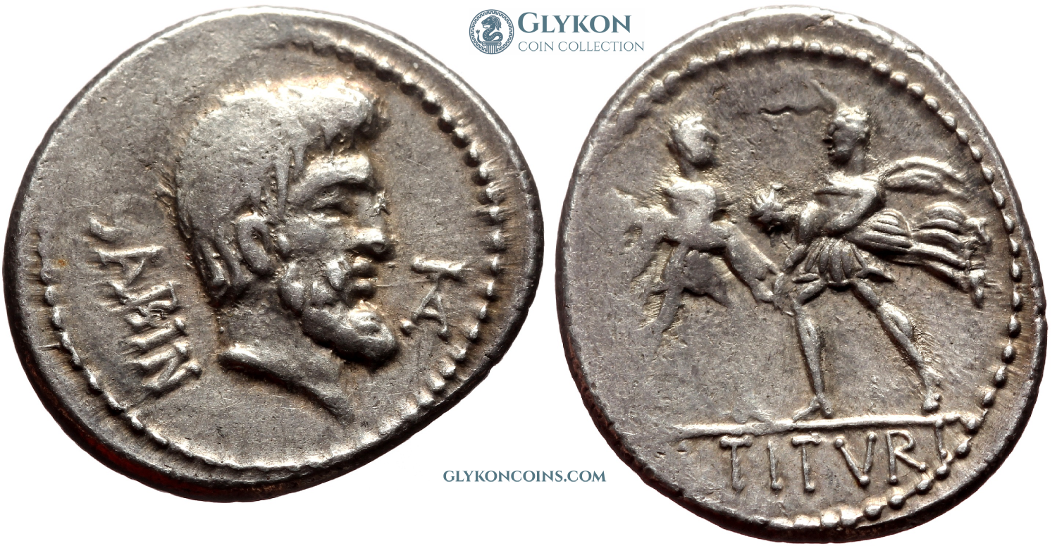 Obverse: Bearded head of Tatius (mythical king of Sabines) to right. Monogram lower right. Legend: SABIN. Reverse: Two archaically dressed Romans carrying off protesting Sabine women. Legend: L.TITVRI in exergue.