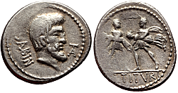 Roman Republic Denomination: Denarius Time: 89 BC; moneyer L. Titurius Sabinus Weight: 3.88 g Diameter: approx. 19.8 mm Reference: Crawford 344/1a