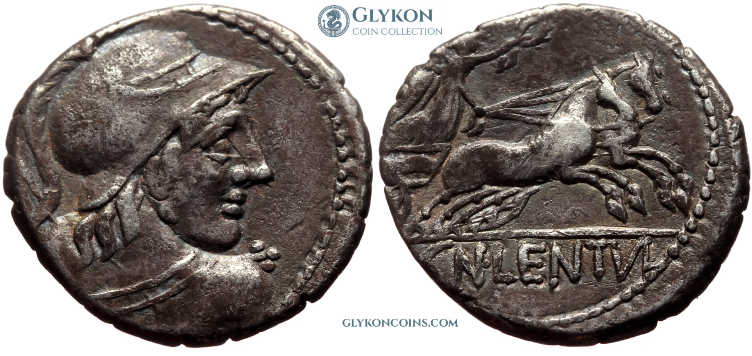 Obverse: Bust of youthful Mars in plumeted Boeotian helmet to right. Reverse: Victory driving racing biga to right, holding wreath. Legend: CN·LENTVL in exergue. |