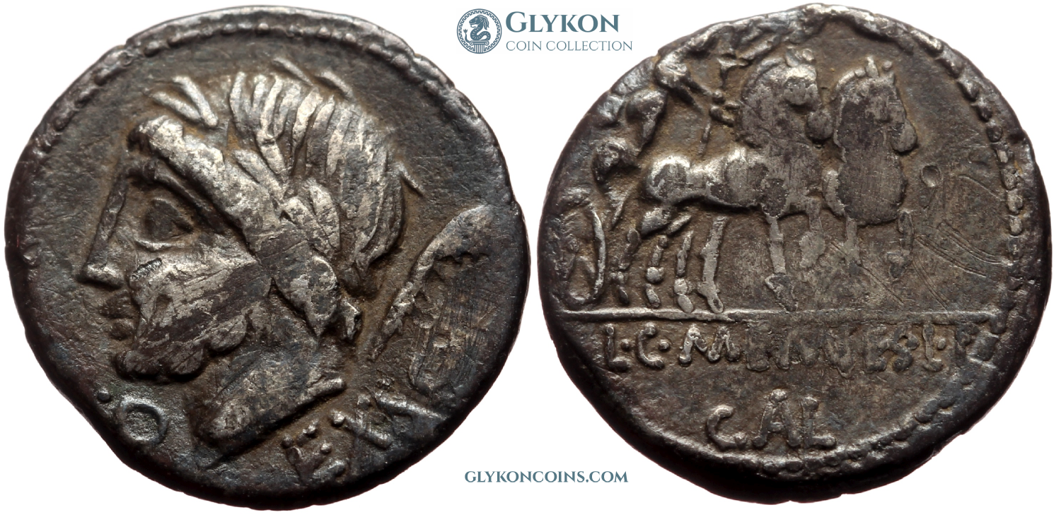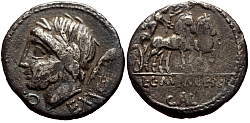 Obverse: Laureate and bearded head of Saturn to left, harpa (type of sickle and symbol of Saturn) behind. Legend: EX·SC, control mark under Saturn's chin. Reverse: Venus driving prancing biga to right, holding scepter. Cupid holding wreath flying above. Legend: L·C·MEMIES·L·F - GAL in exergue. |