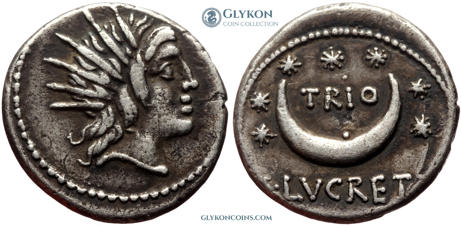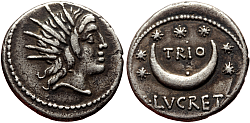Obverse: Head of Sol wearing radiate crown facing right. Reverse: Upward pointing crescent with a dot. Seven stars around. Legend: TRIO - L·LVCRET.