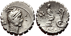 Comment: Very rare if not unique variant with a chicken coop and oracular chickens. In general, this coin is full of religious symbolism and shows much of religious life of the Late Republic. We know that the Romans used chickens for divination, and a plethora of Roman religious cults used snakes. |