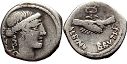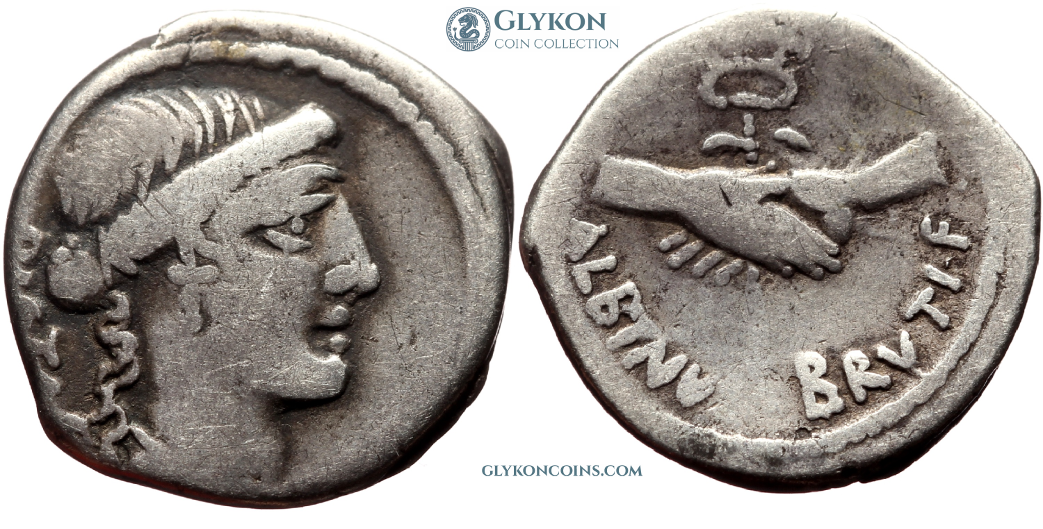 Obverse: Head of Pietas to right. Legend: PIETAS. Reverse: Two hands clasped around a caduceus. Legend: ALBINVS·BRVTI·F.