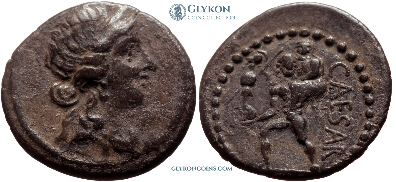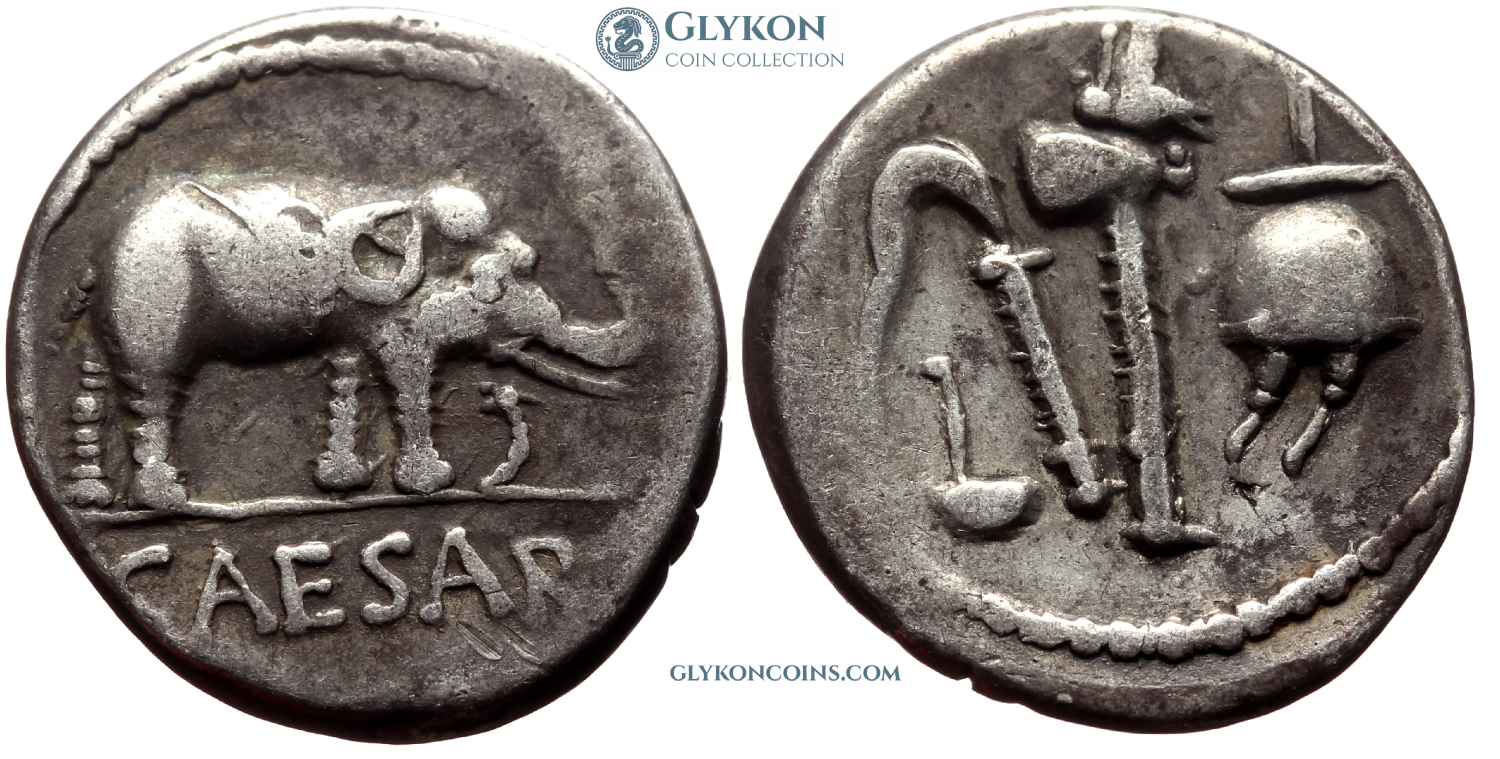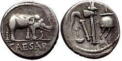 Obverse: Elephant to right trampling an erect serpent. Legend: CAESAR in exergue. Reverse: priestly utensils emblematic for the office of the Pontifex Maximus: culullus, aspergillum, axe and apex.