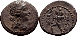 Obverse: Diademed head of Venus to right. Reverse: Aeneas walking to left, carrying is father Anchises on his left shoulder and a palladium (wooden statue of Athena Pallas) in his right hand. Legend: CAESAR.