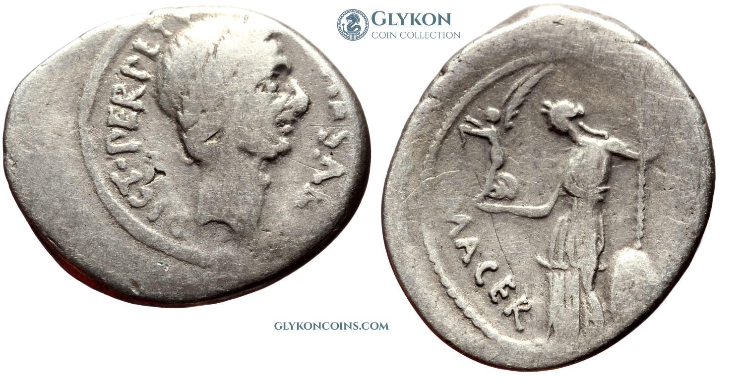Obverse: Laureate head of Julius Ceasar to right. Legend: CAESAR DICT·PERPETVO. Reverse: Venus standing to left, holding small Victory in raight hand and scepter in left hand. Legend: P·SEPVLLIVS MACER.
