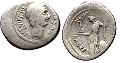 Comment: Caesar is dead, his assassins and former supporters are tearing apart what remains of the Republic's corpse. Mark Antony was the first to take direct action and tried to seize the province of Cisalpine Gaul from Decimius Brutus, one of Caesar's assassins. The plan backfired and was he defeated by a hastily cobbled together coalition of moderate Caesarians, the legal government of the Republic, Decimius Brutus and young Octavian. Marcus had to flee across the Alps to Gaul and lick his wounds with what was left of his army. But the tide was about to turn in his favor. And it was at that time that this tiny coin was minted. Even, or perhaps especially, a defeated army had to be paid or it would abandon its leader. |