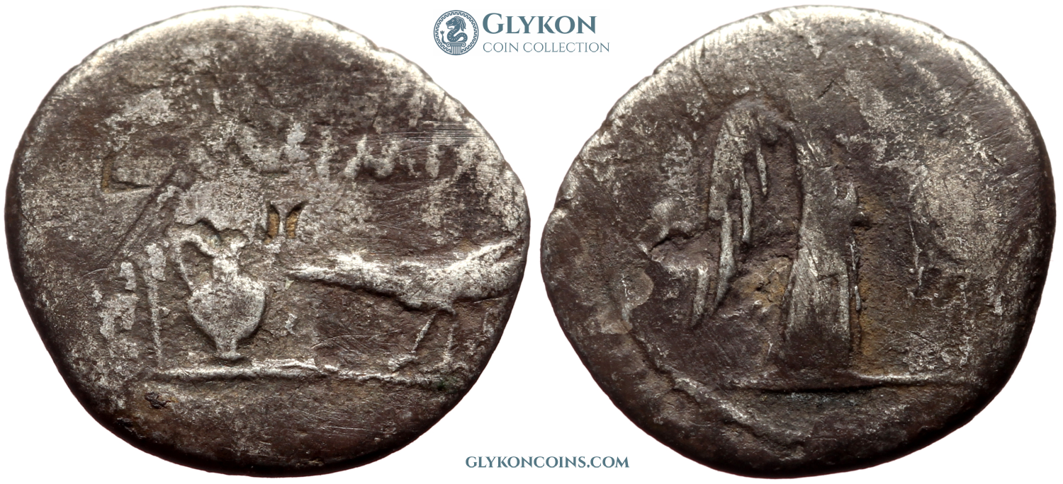 Comment: This particular coin is like the last sigh of a dying era. In 42 BC Rome was in the hands of autocratic Triumvirs challenged by equally autocratic Liberatores, and the military mints from either side issued massive quantities of coins praising the new rulers and their agendas. Like in the eye of a storm, some officials left in the city of Rome pretended to function as if everything was normal. Moneyer Clodius somehow slipped in one apolitical design that might well have been made 20 years earlier, at a much happier time. |
