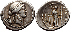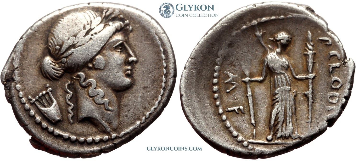 Obverse: Laureate head of youthful Apollo to right, small lyre behind. Reverse: Diana the Lightbringer (Lucifera) standing right holding two long lit torches. Legend: P·CLODIVS·M·F.