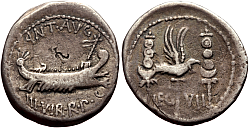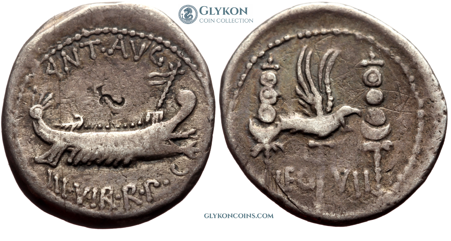 Obverse: War galley to the right. Legend: ANT·AVG III·VIR·R·P·C. Bankers' marks. Reverse: Aquila flanked by two signa. Legend: LEG VII.