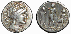 Roman Republic Denomination: Denarius Time: 132 BC; moneyer M. Aburius M. f. Geminus Weight: 3.89 g Diameter: approx. 18.4 mm Reference: Crawford 250/1; Sydenham 487