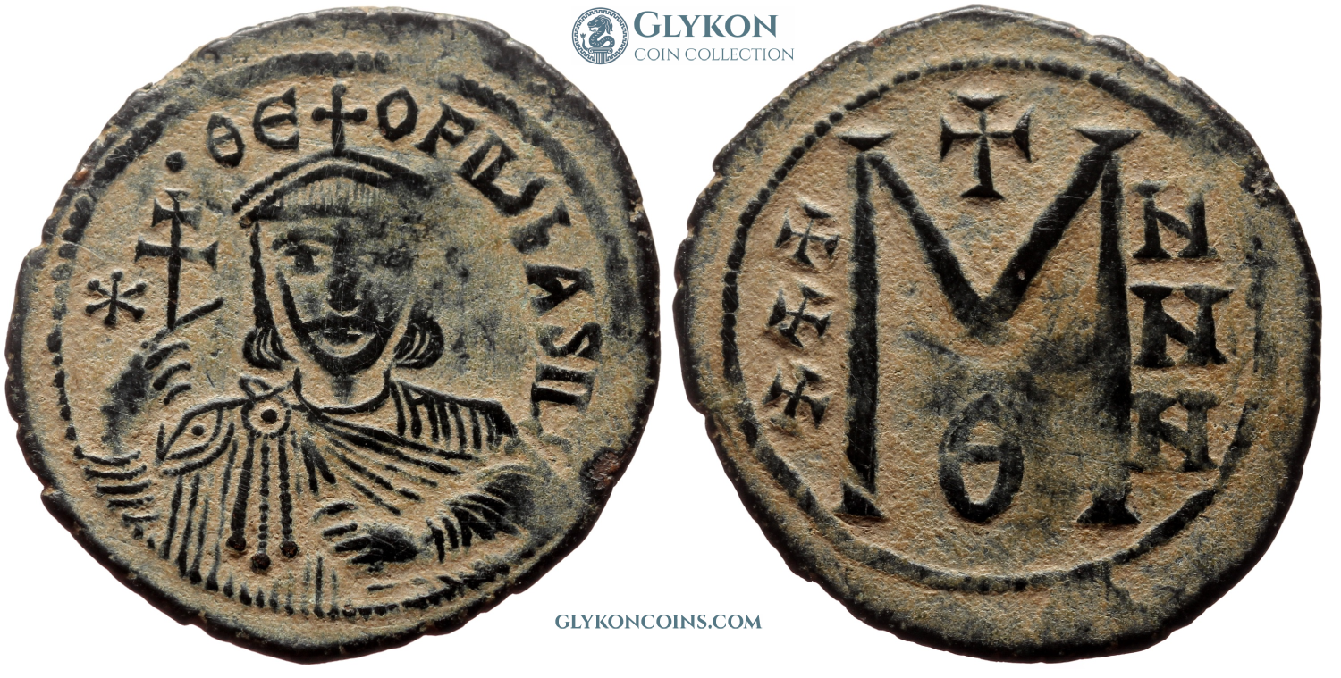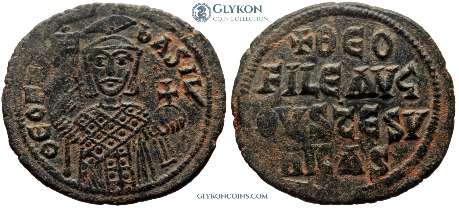 Comment: Much of Theophilus' reign was spent fighting endless wars with the Abbasid Caliphate, still at the height of its temporal power. These wars were fought with mixed results, but at the start of the 830s Theophilus scored some significant victories. This inspired him to issue a new style, "triumphal" follies. The design proved successful and served as a template for Byzantine bronze coins for the next 200+ years. In many aspects, Theophilus' reign was a time of transformation and change. Reportedly a popular monarch (sometimes called "Byzantine JFK"), he managed to pull the still struggling and battered empire onto the path of wholesale recovery. He was also known for refined personal taste, sponsoring automata and art pieces. It was under him that the famous mechanical Byzantine throne was designed and built. He was also known as a connoisseur of Arabic culture, despite spending most of his reign fighting Arabs. His death also marked the end of the Iconoclast controversy, as he was the very last emperor to accede to that doctrine. |