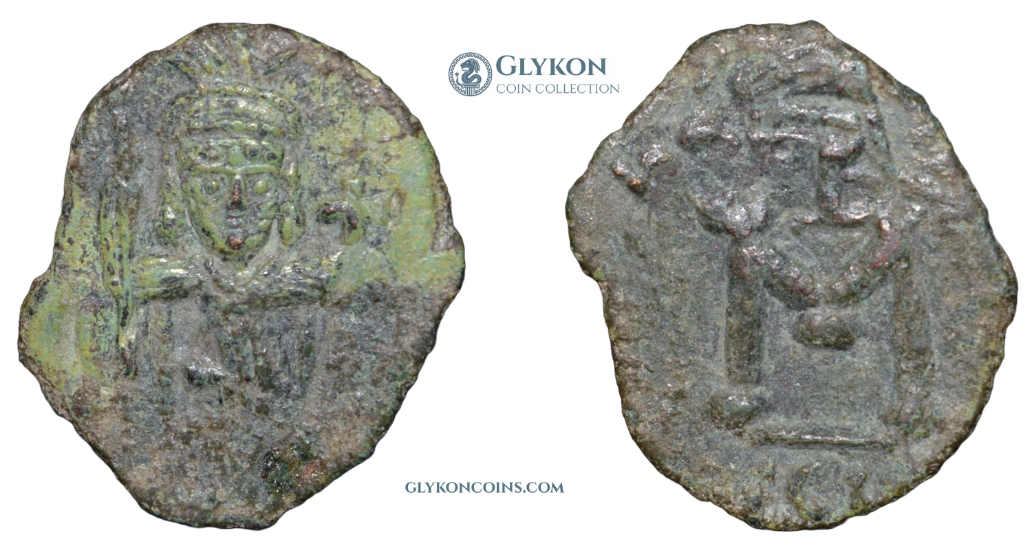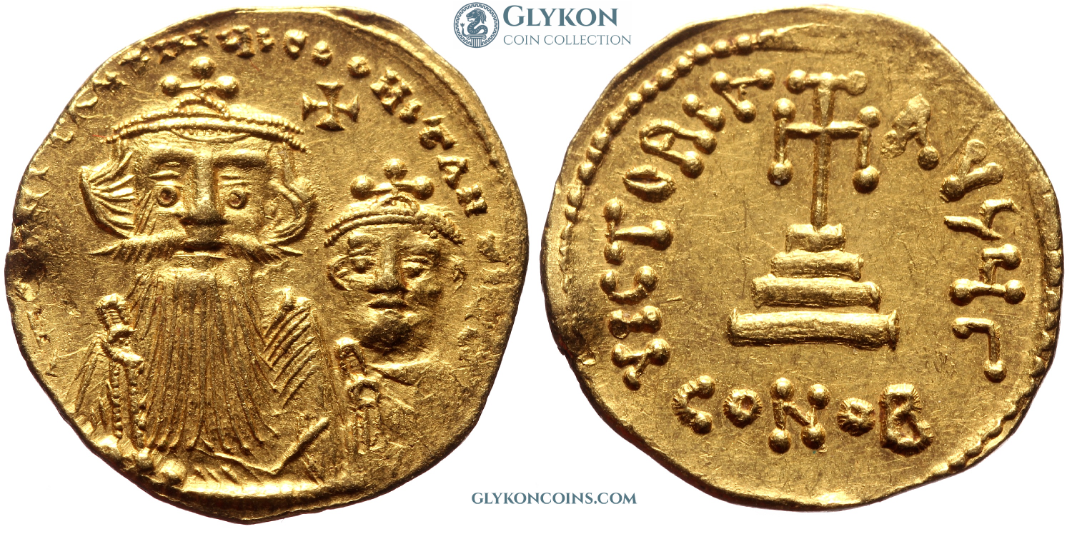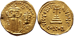 Obverse: Heraclius and his son Heraclius Constantine seated facing, each wearing crucigerous crown and chlamys and each holding a globus cruciger. Small cross above, two globes on the sides. Legend in bungled letters: dd NN hERACLIUS Et hERA CONSt