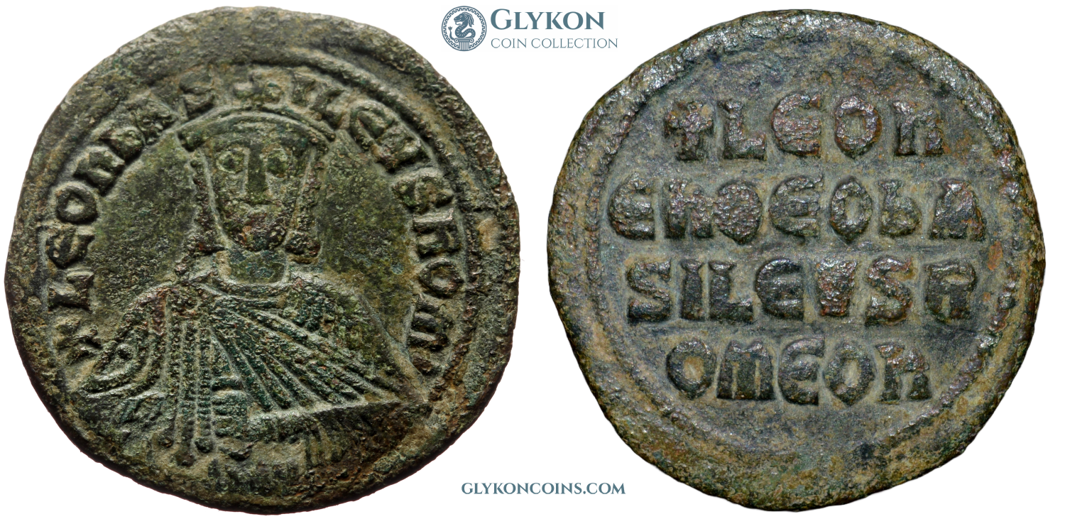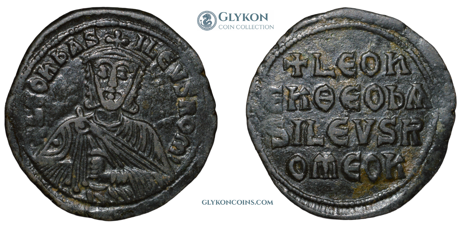Reverse: Legend in four lines: +LЄOn / Єn ΘЄO bA / SILЄVS R / OmЄOn (Leo, in God, Emperor of the Romans). |