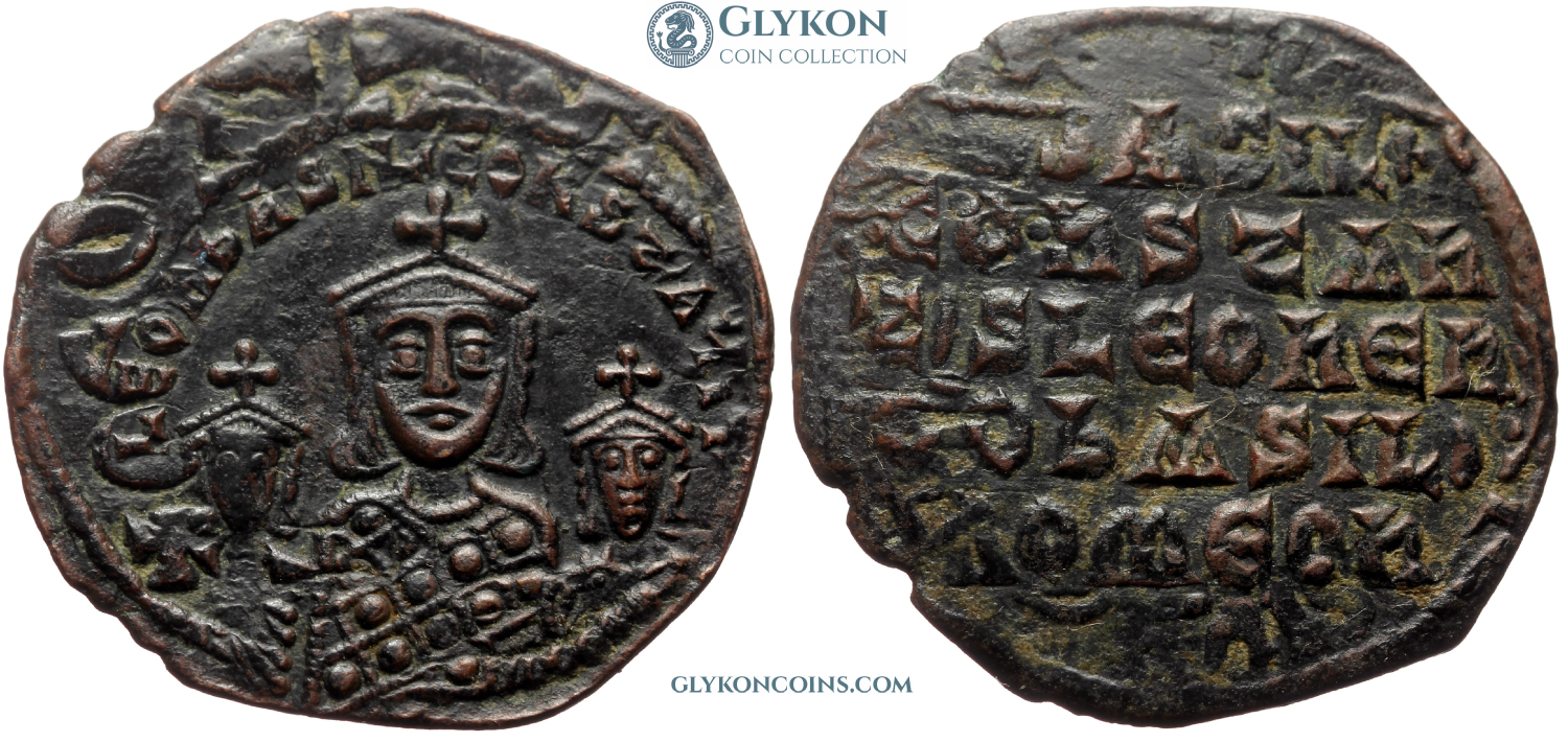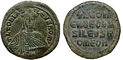 Obverse: Facing bust of Theophilus, wearing chlamys and crucigerous crown, holding patriarchal cross in right hand and akaka in left hand. Cross above. Star on the left. Legend: •ΘЄOFIL bASIL