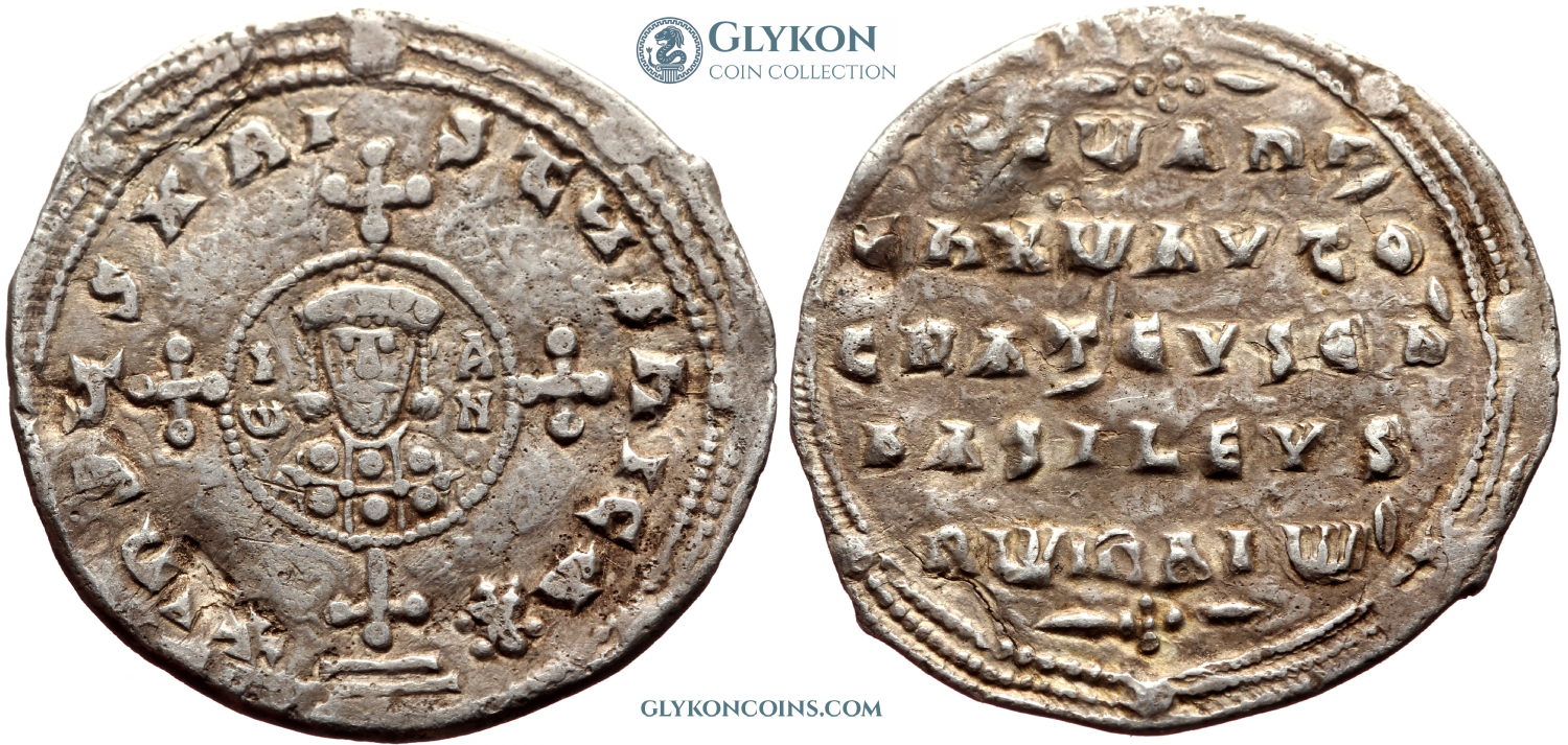 Reverse: Legend in seven lines: + / IωANN' / Єn Xω AVtO / CRAT' EVSEb' / bASILEVS / RωmAIω'/ + |