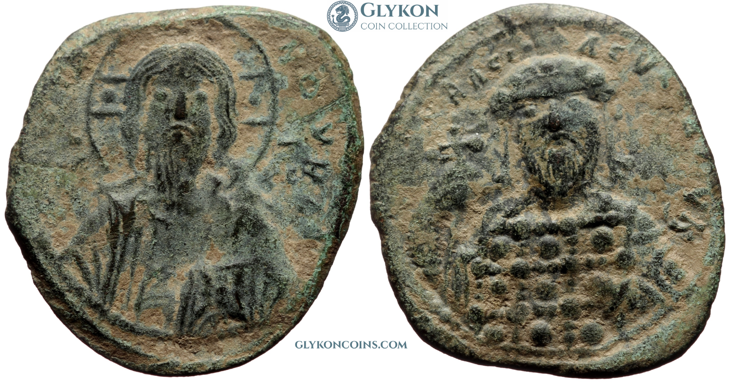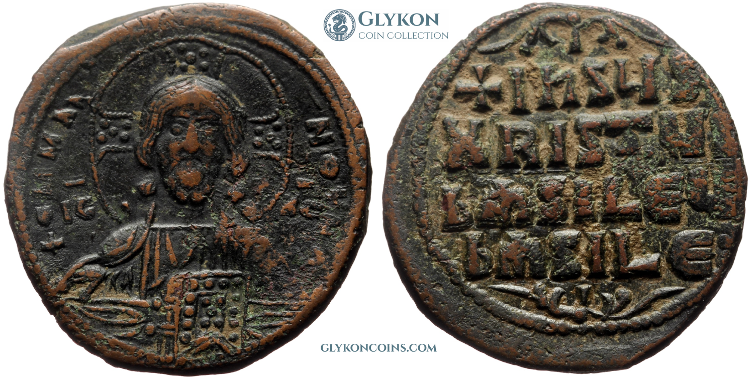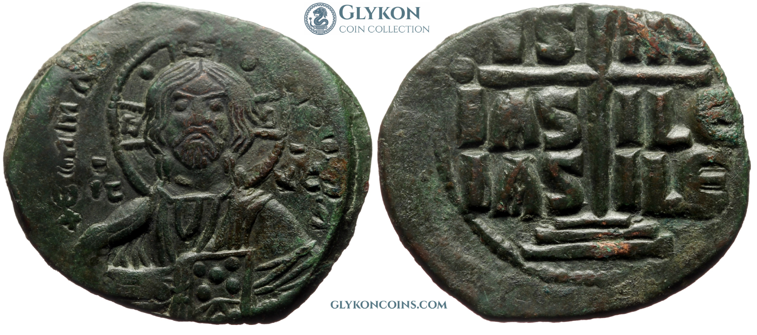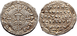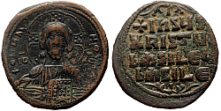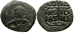 Obverse: Facing bust of Christ with a dotted cross behind head, holding a dotted book of gospels. Legend: IC-XC NI-KA (Jesus Christ conquers) Reverse: In the quarters of a large cross: C-R P-Δ. Small globus cruciger and two pellets at the end of each arms of the cross.