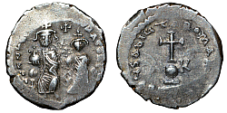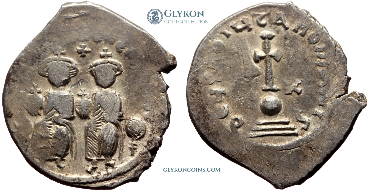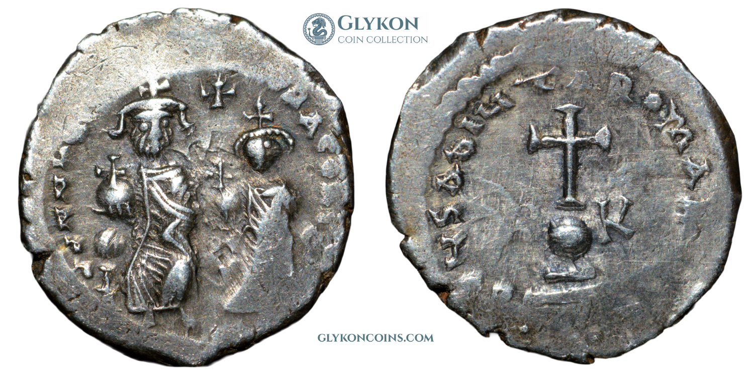 Comment: The long and tragic reign of Heraclius is something to behold. Full of defeats and victories, dramatic reversals of fortune, the emperor's own ineptitude and sloth interspersed by flashes of brilliance and resilience, family drama, and of course skillful propaganda that attributed Heraclius' failures to his predecessor at the meager cost of changing the timeline of events. Heraclius' reign witnessed first the climactic war with Sassanid Persia, in which the Empire for a moment seemed poised to collapse, followed by a brilliant, sudden and massive victory. Only for this victory to be engulfed by the unstoppable wave of Islamic invasions. This dramatic and chaotic period is reflected in the coinage. In desperation during the low ebb of the war with Persia, Heraclius ordered the melting down of church treasures. This marked the sudden return of silver coins onto the market after almost complete absence for about two centuries. These silver coins, conventionally named hexagrams, reflect the horrific times in which they were produced. The reverse legend plainly pleads “May God save the Romans!”, as if only divine intervention could have saved the Empire from the situation it found itself in. |
