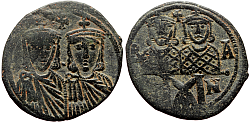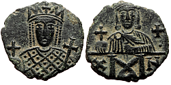 Comment: Pictured here is the drama of one of the darkest Byzantine stories: a mother fighting with her own son for power. We can already see how she pushes her son to the background, relegating him to the role of a smaller figure on the reverse. She finally had him blinded and killed, a crime that shocked the world at that time. This bloody usurpation was also one of the reasons why, in the faraway and barbaric west, a new empire arose that soon threw down the gauntlet in the fight for legitimacy as the true Roman Empire. |