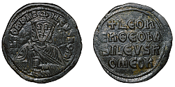 Obverse: Facing busts of Leo V bearded and Symbiatos-Constantine beardless, each wearing crucigerous crown and chlamys. Legend: LЄOn S COnSt