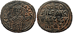 Basil I the Macedonian (867-886 AD) Denomination: follis Mint: Constantinople Time: 870-879 AD Weight: 7.44 g Diameter: approx. 28.8 mm Reference: Sear 1713