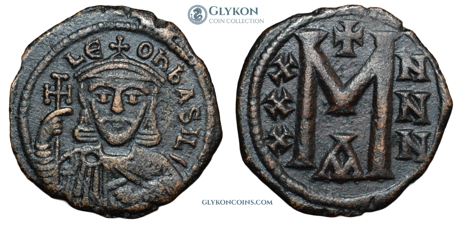 Obverse: Facing bust of bearded Leo, wearing loros and crucigerous crown, holding large cross potent in the right hand. Legend: ΛЄOn*