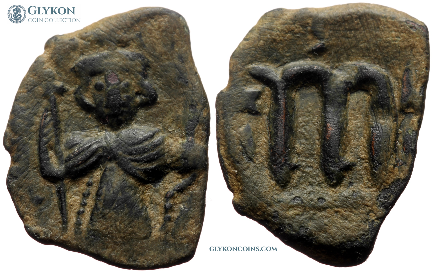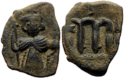 Obverse: Facing figure of Justinian II in armor and plumed helmet, holding spear in right hand and globus cruciger in left hand. No legend. Reverse: Large M indicating denomination, SCL in exergue. Additional monograms or remnants of overstruck previous patterns. |