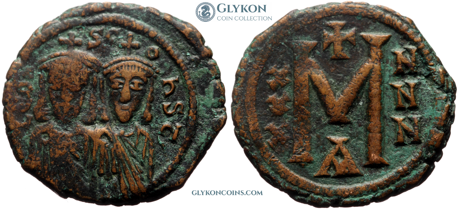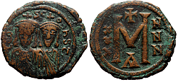 Obverse: Facing bust of youthful Justinian II, wearing crucigerous crown and chlamys, holding globus cruciger. Legend: IЧSTINIANЧS+ Reverse: Large M indicating denomination with a cross above, officina symbol Є below. CON in exergue. On the right regnal year II between a cross above and a dash below.