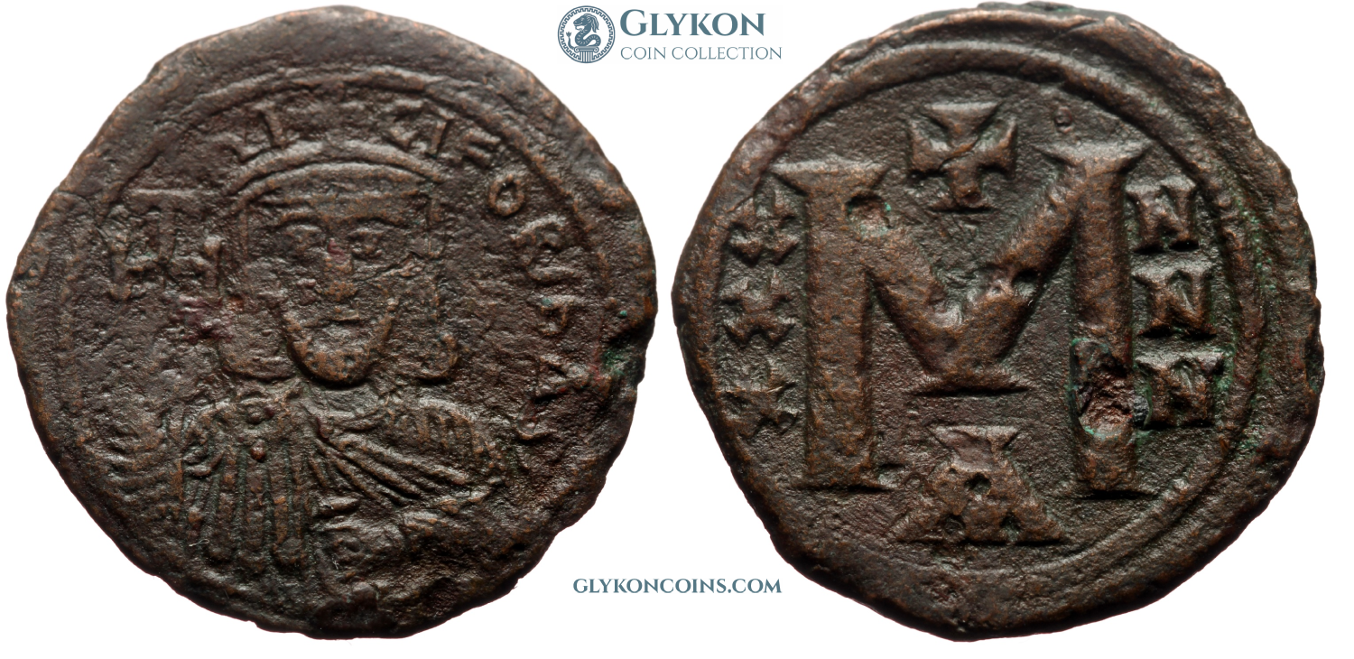 Obverse: Facing bust of youthful Heraclius with short beard, cuirassed, wearing helmet-diadem with short plume, holding globus cruciger in right hand and shield in left hand. Legend in bungled letters: DN hRACLI PERP AVG Reverse: Large M indicating denomination of 40 nummi. Cross above, officina symbol B (sexond officina) below. Left and right ANNO and regnal year II (2). KYZ below in exergue. |