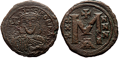 Obverse: Facing figure of Justinian II, wearing chlamys and holding globus cruciger in right hand. No legend. Reverse: Large M indicating denomination. Monogram above, SCL in exergue below.