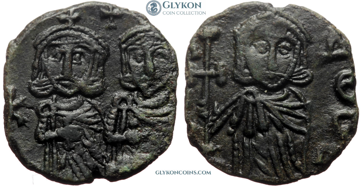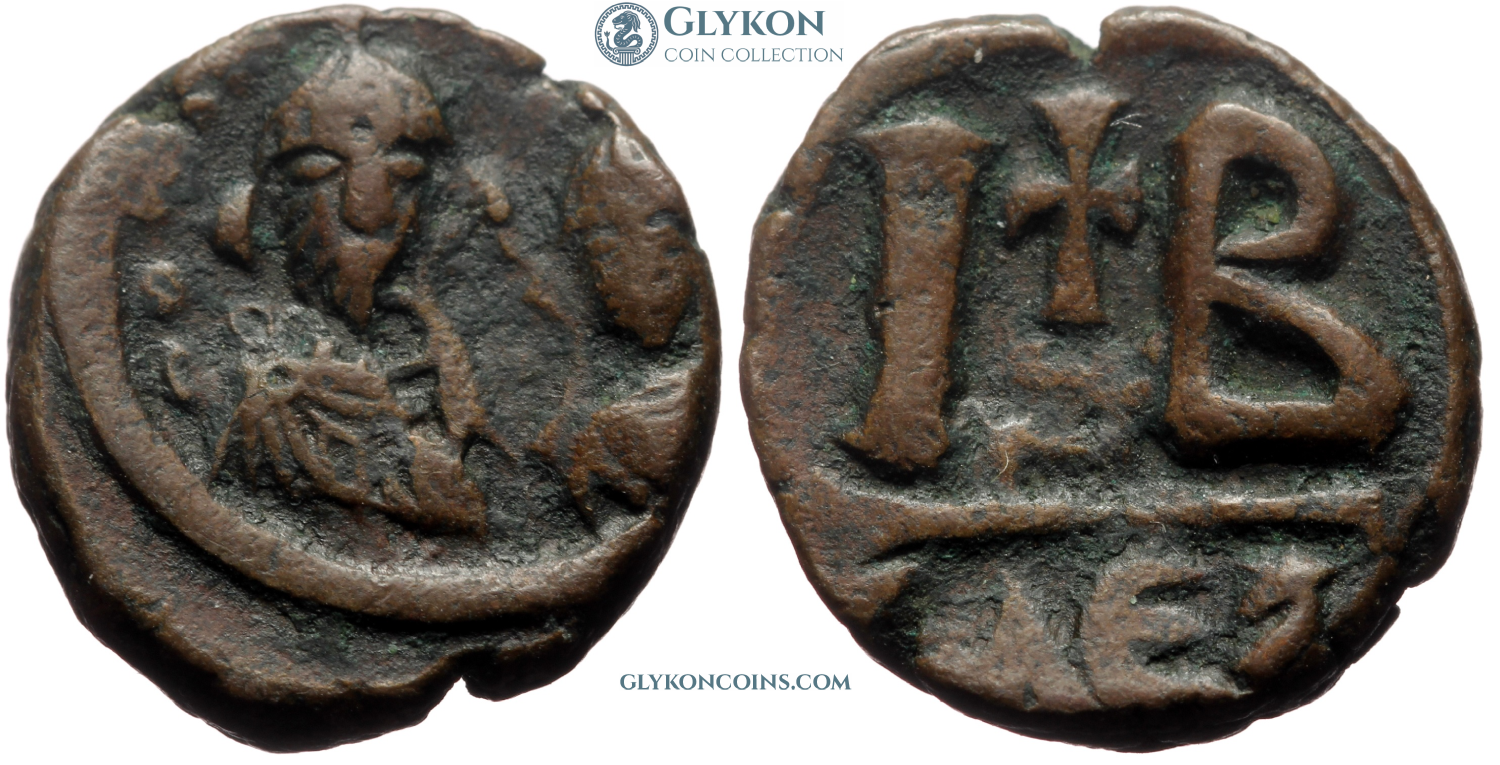 Obverse: Facing busts of bearded Heraclius on the left and beardless Heraclius Constantine on the right, each crowned and wearing chlamys. Legend: dd mm h hERAC Reverse: Large I and B indicating denomination of 12 nummi. Between them large cross potent on two steps. ΑΛЄƵ below in exergue.