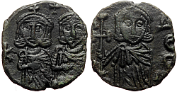 Obverse: Facing busts of Leo IV with short beard and youthful Constantine VI beardless, each wearing crucigerous crown and chlamys. Cross above.
