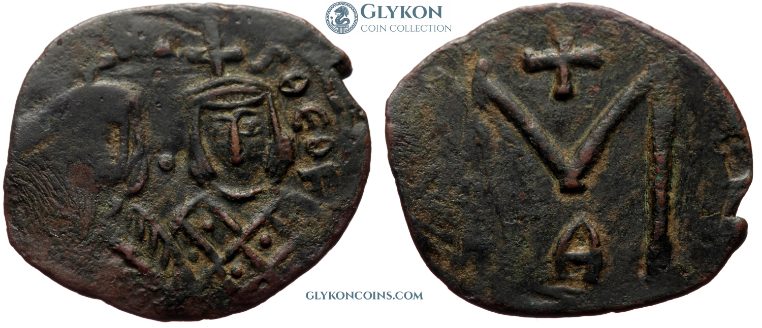 Obverse: Two crowned figures standing facing: Constans II, bearded and armored, holding a long cross; and his son Constantine (later Constantine IV), beardless and in chlamys, holding a globus cruciger. No legend. Reverse: Large M indicating denomination of 40 nummi. Monogram above, SCL below. Standing facing figures of Constans' younger sons, each crowned, wearing chlamys and holding globus cruciger: Heraclius on the left and Tiberius on the right.