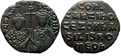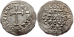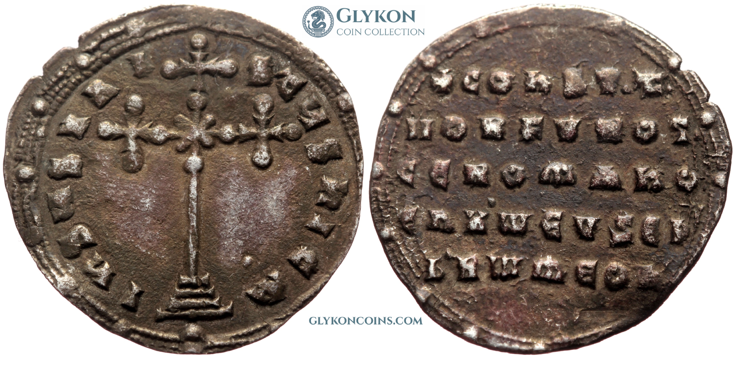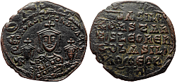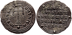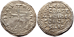 Obverse: Facing busts of young crowned Constantine wearing loros and crowned regent empress-mother Zoe wearing chlamys, both holding together a large patriarchal cross between them. Legend: +COnStAnt' CЄ ZOH b'