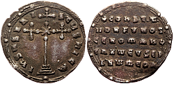 Obverse: Cross crosslet mounted on four steps. An X in the middle and a medallion mounted in the middle of the lower shaft. Flanked by two small facing busts of Basil II (left, bearded) and Constantine VIII (right, beardless), both crowned and wearing loros. Legend: Єn tOVtω nICAt bASILЄI C CωnSt' (Victorious Basil and Constantine).