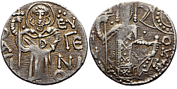 Obverse: Saint Eugenius standing facing and holding a long cross. Legend: ΟΑΓΙ ЄVΓЄΝΙO.