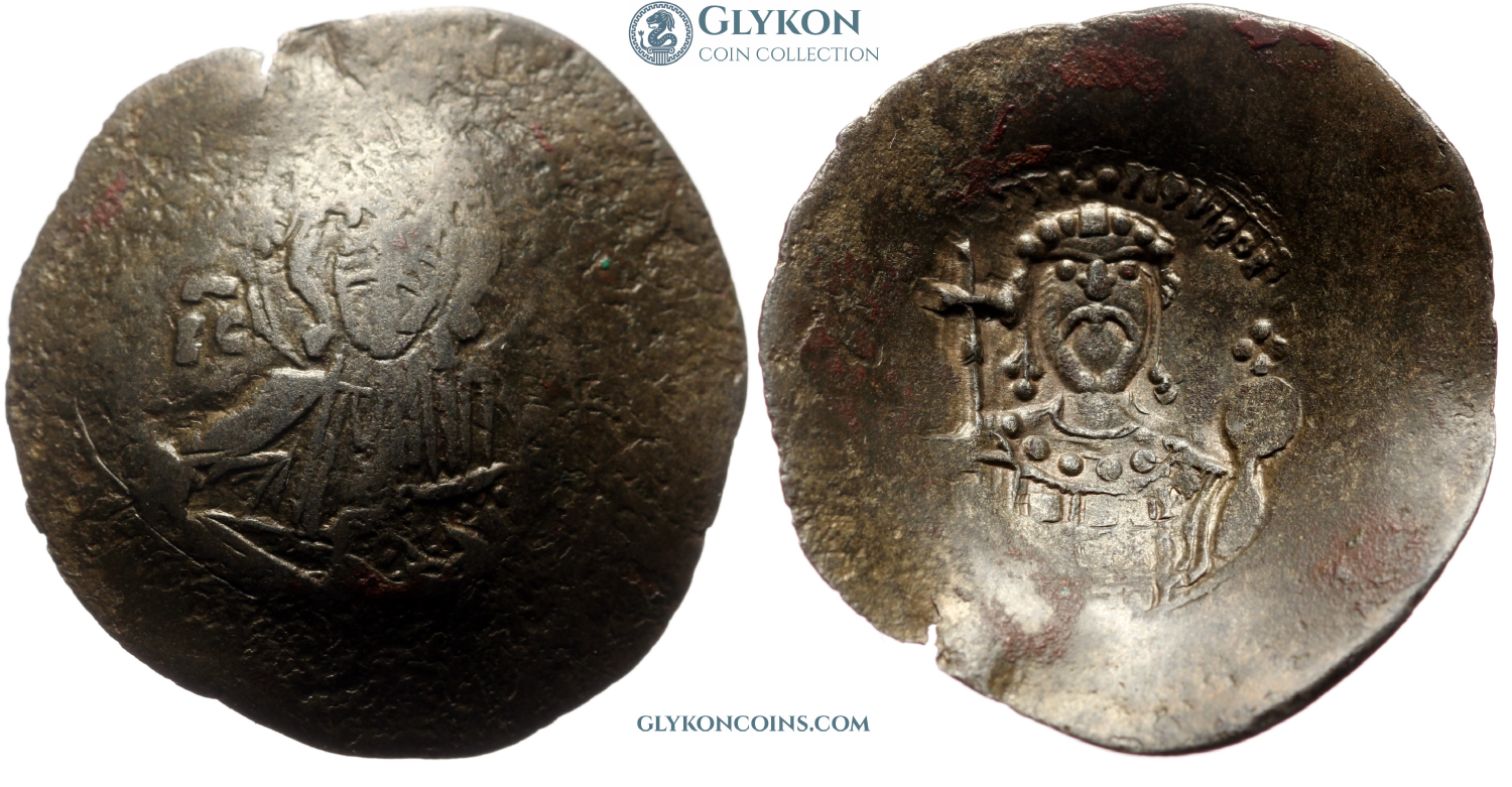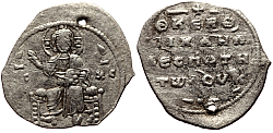 Obverse: Christ with nimbate (that is, haloed) cross behind head, seated on a throne, holding a book of gospels. Legend: IC-XC (monogram of Christ). Reverse: Facing bust of Alexios, crowned, wearing divitision and loros, holding sceptre cruciger in right hand and globus cruciger in left hand. Legend: ΑΛЄΖΙω ΔЄϹΠτ (Emperor Alexios).