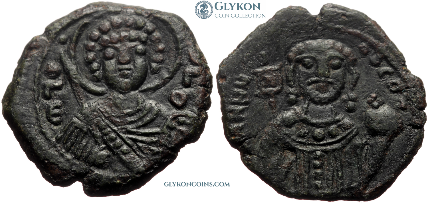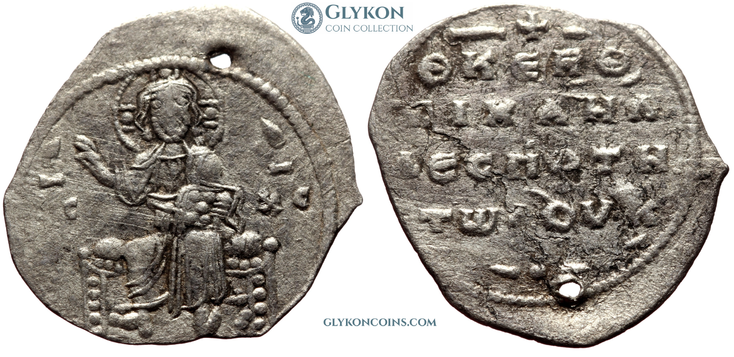 Obverse: Facing bust of Christ with nimbate (that is, haloed) cross behind head, holding a dotted book of gospels. Legend: IC-XC (monogram of Christ). Reverse: Facing bust of John, crowned, wearing divitision and loros, holding sceptre cruciger in right hand and globus cruciger in left hand. Legend: ΙΩ ΔЄϹΠΟΤ Τ ΠΟΥΠΟΓΝΤ (Ioannes Despotes ho Porphyrogennetos - John, emperor, the purple-born). |
