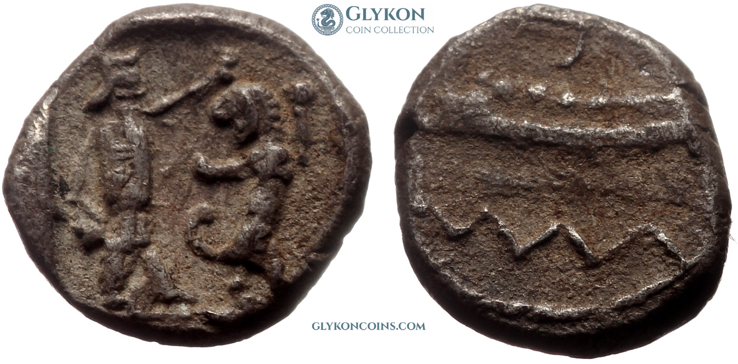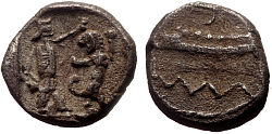 Obverse: Galley left, wave below. Reverse: Witin square incuse: King or hero to right fighting a standing lion to left. |