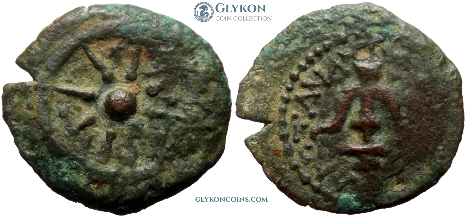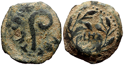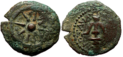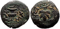 Judea, Hasmonean dynasty, Alexander Jannaeus (103–76 BC) Denomination: AE Prutah (Lepton) Time: 103–76 BC Weight: 1.80 g Diameter: approx. 15.7 mm Reference: Hendin 469; Meshorer 8