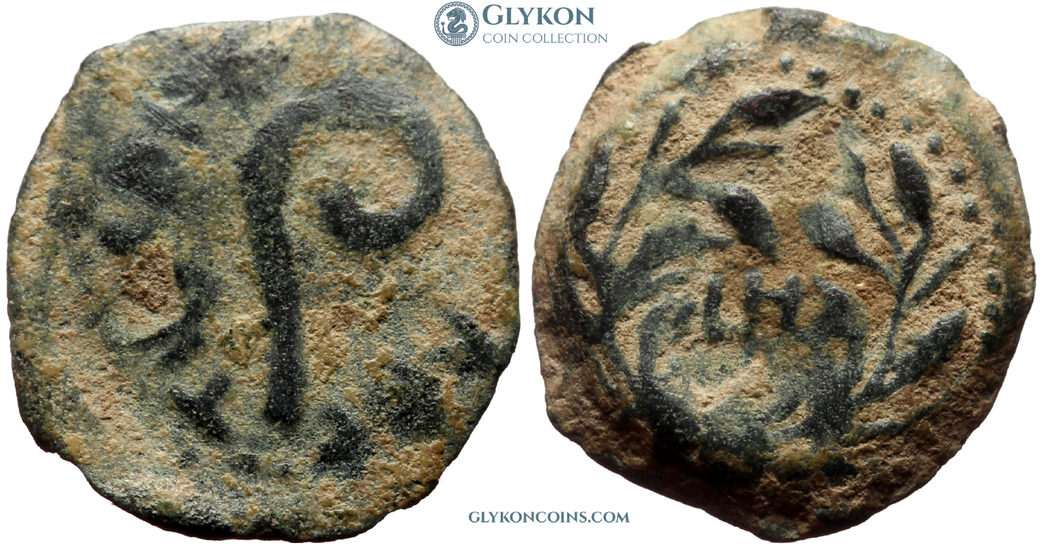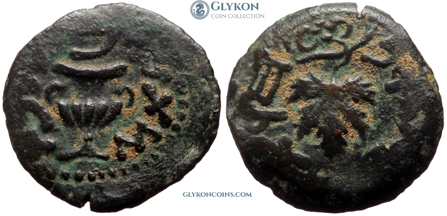 Judea, time of the First Jewish-Roman War (66–73 AD) Denomination: AE Prutah (Lepton) Time: 67/68 AD Weight: 3.12 g Diameter: approx. 18.0 mm Reference: Hendin 661