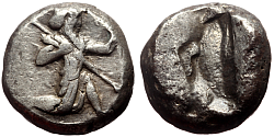 Obverse: Bearded Great King kneeling to right, holding bow and spear. Reverse: Irregular oblong incuse. |