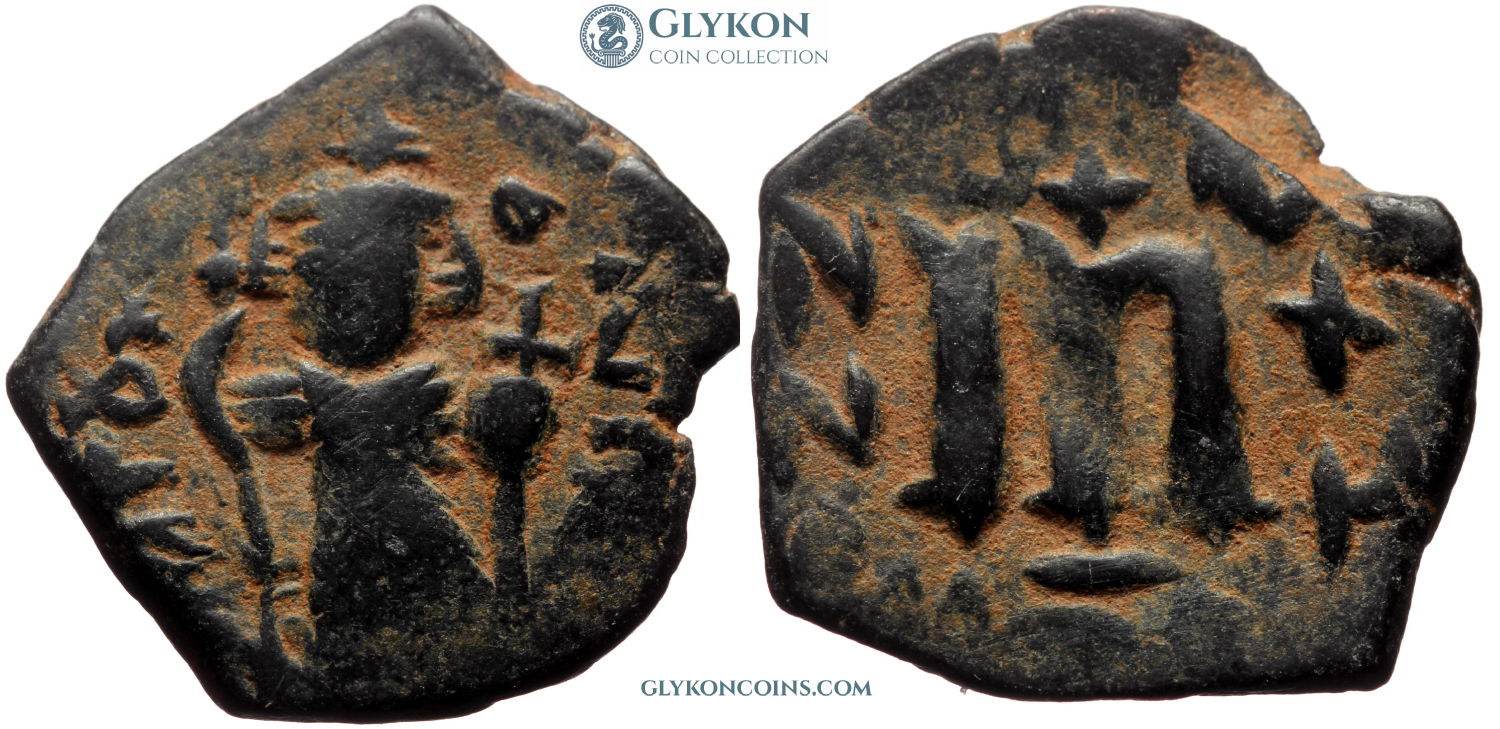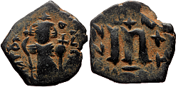 Obverse: Facing figure of crowned emperor beardless or with short beard, wearing chlamys, holding long cross-topped scepter and globus cruciger. Legend: indeterminable early Arabic or corrupted Greek/Latin. Reverse: Large M indicating denomination of 40 nummi flanked by NN and XX, cross above, other indiscernible signs.